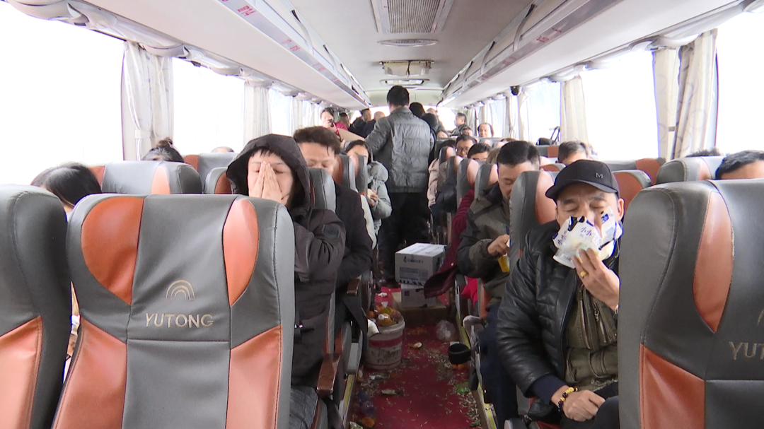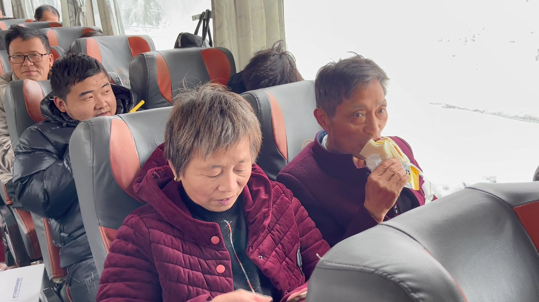 在滞留的车队中,有一辆满载旅客的从广东深圳前往湖南怀化的大巴车,车上很多旅客从上车开始到现在一直没有吃东西,了解到情况后,工作人员立即搬了两箱面包、一箱牛奶上车分发。拿到面包后,很多乘客立马迫不及待,大口吃了起来。