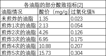 酸价是用来评价食用油酸败程度的指标,酸价越高说明油脂酸败越严重。有研究对比了未煎炸食用油与煎炸 1 次、2 次、3 次、4 次、5 次食用油的酸价(每次油炸 2h),发现油脂回锅使用的次数越多,产生的酸价和过氧化值也越多,煎炸 5 次的油脂的酸价和过氧化值分别是煎炸 1 次的 7.4 倍、5.6 倍。
