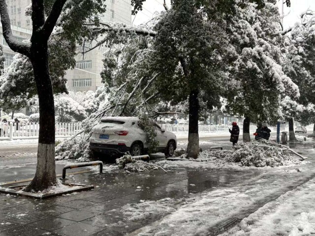 (1月22日,长沙骤降暴雪,积雪压断树枝,砸中了行驶中的车辆。通讯员 摄)