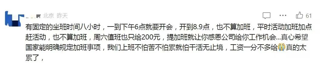 网友5:这个要看工作岗位和内容了,我是做销售的,工作弹性比较大,平时基本上不会加班,甚至有时候提前下班,周末偶尔跟客户对接些事情也正常,我个人觉得这种就不算加班。但是职能岗坐班有固定上下班时间的,周末应该算加班。