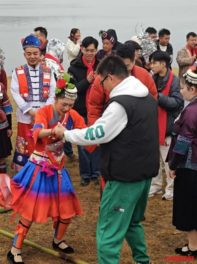 三里村村民与游客一起跳侗族舞蹈。高煜棋 摄