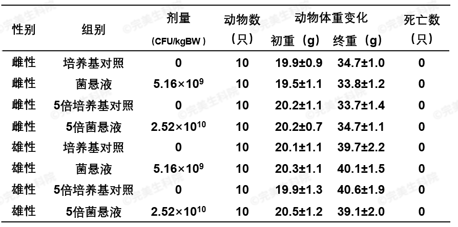 结果显示,小鼠腹腔注射和经口灌胃期间,小鼠状态正常,无中毒体征和死亡情况,即鼠李糖乳酪杆菌LRPerfectus®158无致病性。