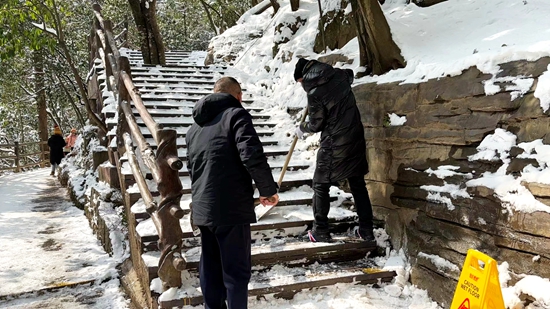 据悉,为保障游客安全出行、景区有序运行,张家界国家森林公园(武陵源景区)迅速启动应急预案,第一时间组织工作人员开展除冰铲雪行动,对结冰严重路段采取封闭措施,并增设安全提示牌,打造良好行走空间。