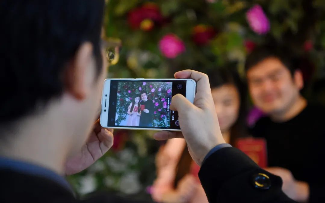 ▲资料图:在辽宁沈阳市皇姑区民政局婚姻登记处,两位新人手持结婚证拍照留念。图/新华社