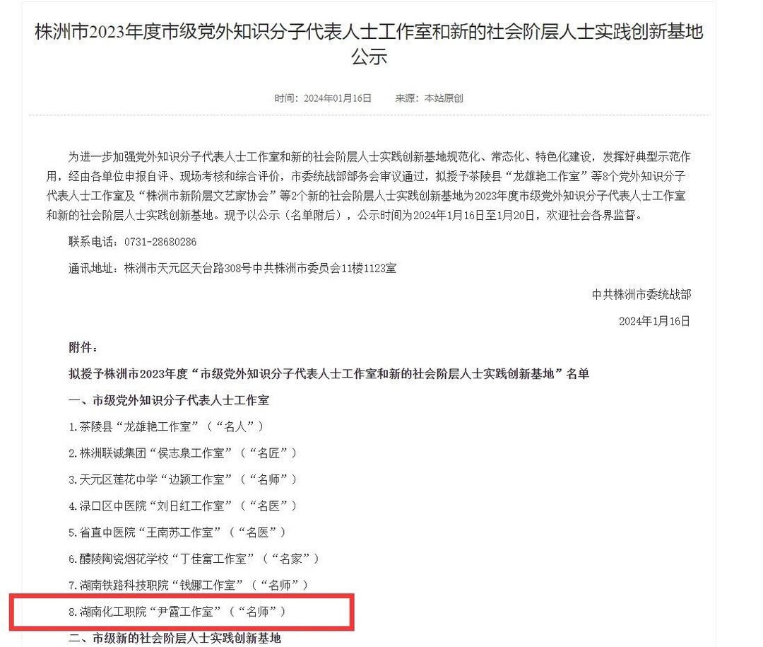 为进一步加强党外知识分子代表人士工作室和新的社会阶层人士实践创新基地规范化、常态化、特色化建设,发挥好典型示范作用,近日,株洲市委统战部评选出8个党外知识分子代表人士工作室,湖南化工职业技术学院“尹霞工作室”成功获评,成为株洲市党外知识分子代表人士工作室。