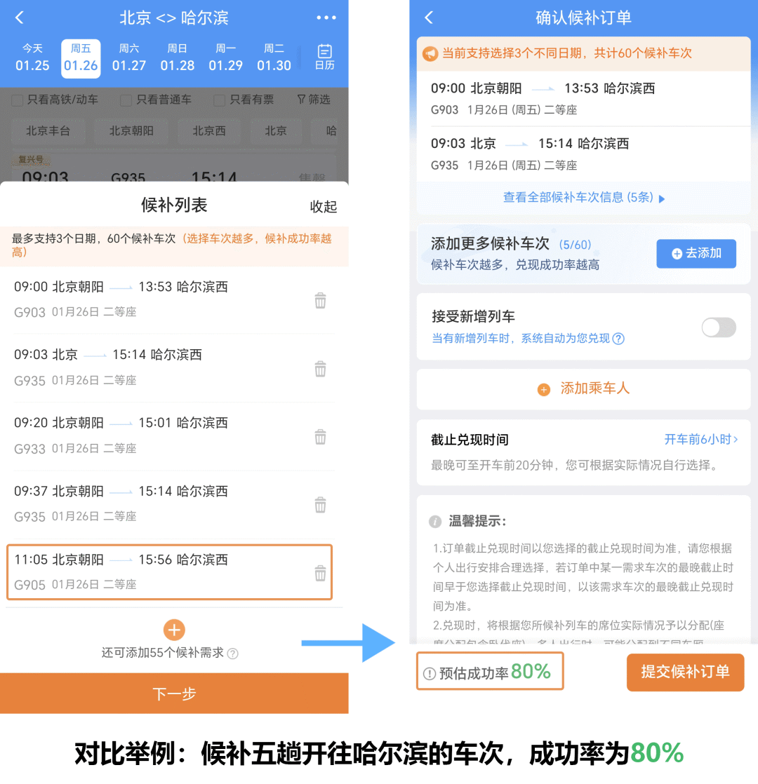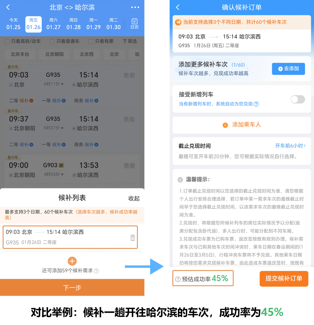 增加候补列车数,以北京至哈尔滨候补购票为例
