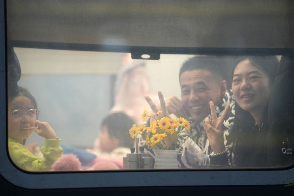 2024年1月26日,在哈尔滨火车站,旅客在列车上向窗外比手势。 新华社记者 王建威 摄