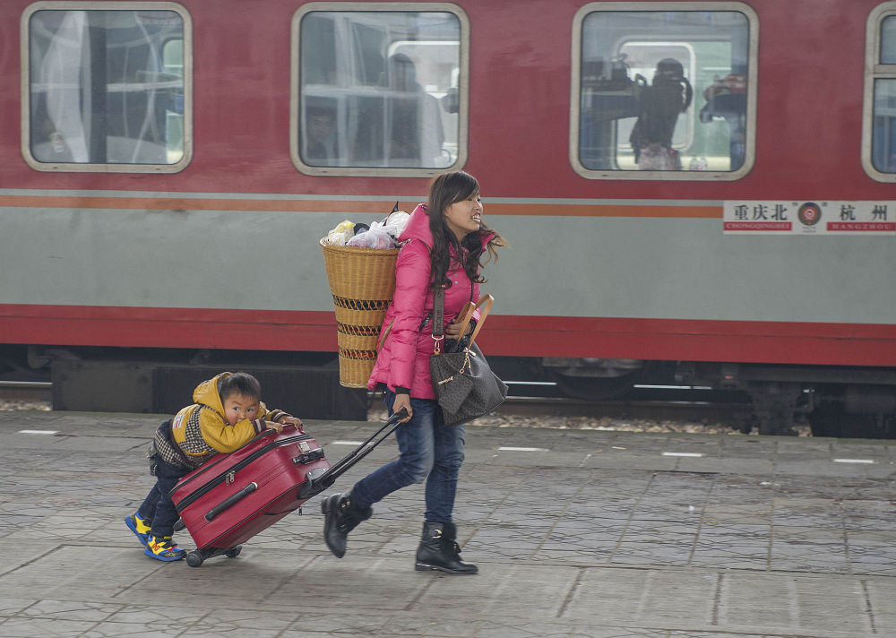2013年1月25日,下了火车的“小候鸟”沈毅跟着妈妈从浙江杭州回重庆秀山县老家过春节。新华社记者陈诚摄