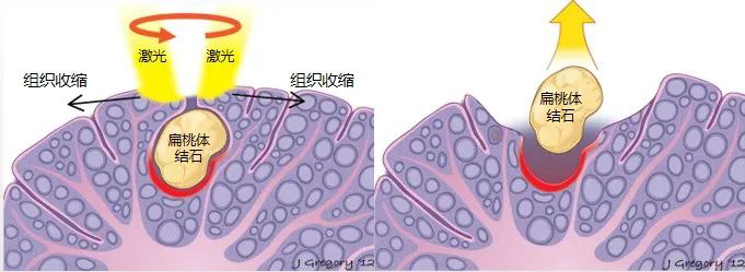 因扁桃体结石中通常存在细菌及其产物,可具有特殊臭味,这也是部分人群即使非常注意口腔卫生的情况下仍存在口臭的原因。以上症状可能在扁桃体结石脱落后缓解,但随着新的扁桃体结石形成及排出又会再次出现。前已述及,扁桃体结石位于扁桃体隐窝中,因此最为直接有效的处理手段即为人工清理。可以采取包括挤压、抓取、冲洗等措施(如无明显外移迹象则不建议强行清理),如扁桃体结石能顺利排出则可有效缓解症状。除此之外,加强口腔卫生如饭后漱口认真刷牙可能有助于减少扁桃体结石的发生。正因结石是发自扁桃体隐窝,于是有一些采用CO2激光烧灼、热力学破坏(等离子)等方法开放扁桃体隐窝、以期减少扁桃体结石生成的报道。小规模研究表明此法效果良好。而由于到达扁桃体上皮层的抗生素浓度有限、生物膜态细菌对抗生素抗性较强、定植细菌种属不明,所以通常不建议使用抗生素治疗扁桃体结石。此外,虽然扁桃体隐窝结石是口臭的罕见病因,但对于能够排除诸如口腔卫生、牙健康等其它可能病因并经自行清洁扁桃体隐窝等手段充分处理后仍存在明显持续的口臭者,还可考虑行扁桃体切除手术。
