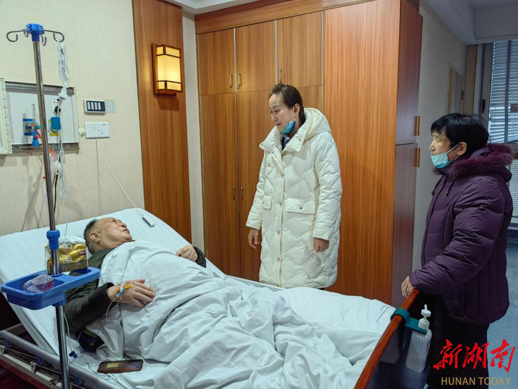 校党委副书记苏玲(中)走访慰问生病住院的老党员、老干部符方照(左)和老党员吴安喜(右)