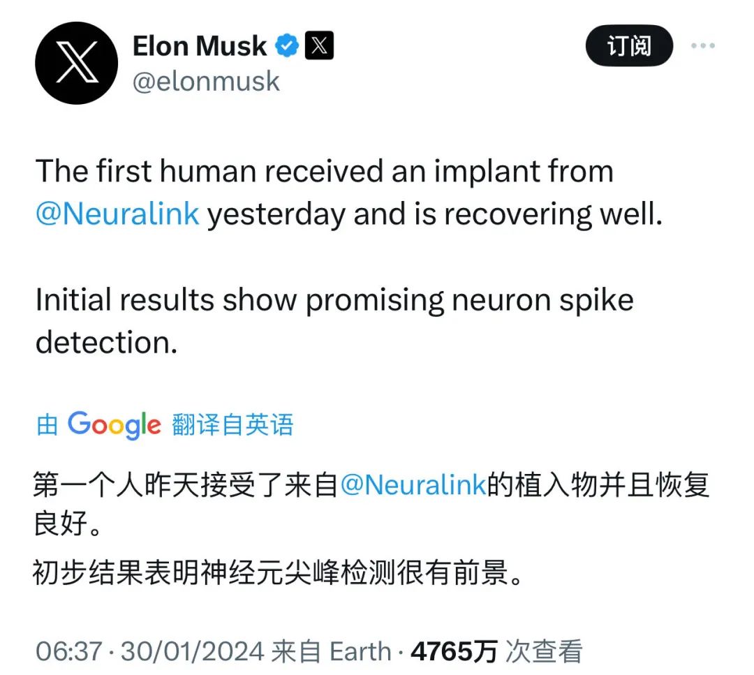 北京时间1月30日,“硅谷钢铁侠”马斯克发文称:“昨天,第一位人类患者接受了Neuralink的植入手术,目前恢复良好。初步结果显示采集到Spike(锋电位)信号。”