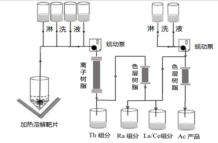 近期,中国科学院近代物理研究所核化学室秦芝研究员团队,利用兰州重离子加速器研究装置(HIRFL)提供的束流轰击金属钍靶,并采用自主研制的自动化分离设备,成功制备医用同位素锕-225。相关成果申请了一项发明专利并获得授权。 作为可应用于肿瘤靶向α粒子疗法的放射性同位素,锕-225具有非常匹配肿瘤靶向治疗的半衰期,其较高的线性能量传递值能够有效打断DNA双链,在杀死癌细胞的同时,对周围健康组织损伤极小,因此被广泛应用于治疗小体积肿瘤和多种转移性癌症。 国际上用于临床研究或药物合成用的锕-225同位素主要利用钍-229衰变产生,每年产量不足2.5居里,而我国全部依赖进口。 高能质子辐照天然钍靶是实现锕-225大规模量产的有效技术途径之一,但是该方法中的散裂反应产物复杂,几乎覆盖半个元素周期表约400种核素,给化学分离纯化工作带来了极大的挑战。秦芝团队利用兰州重离子加速器研究装置(HIRFL)提供的束流轰击金属钍靶,采用自主设计加工的自动化分离系统,实现了医用同位素锕-225批量化、可重复的分离纯化,避免了繁琐的手动操作和高剂量放射性对操作人员带来的潜在风险。