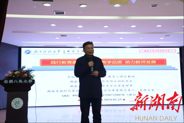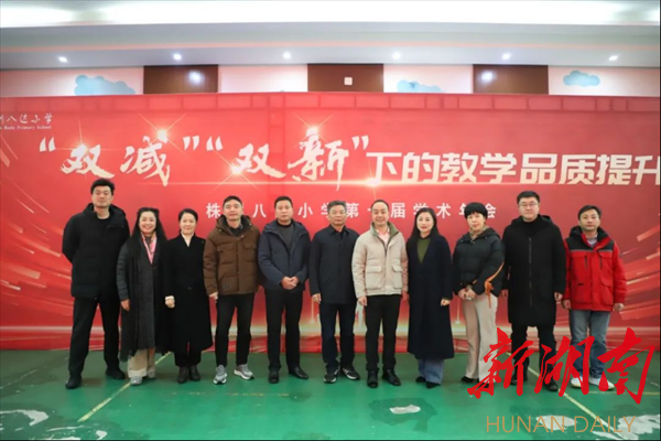 新湖南客户端1月29日讯(通讯员 谢虹)为推动八达小学教育集团全方位、多元化、高质量发展,充分发挥教研的引领和驱动作用,近日,株洲八达小学教育集团举行“双减”“双新”下的教学品质提升学术年会交流活动。湖南科技大学教育学院党委书记李炳煌,荷塘区教育局副局长过斌,区教育教学研究指导中心主任吴健、副主任赵腾达,区教育教学研究指导中心办公室主任谭政及集团校校领导,罗敏小学校长工作室以及帅慧娟小学英语工作室成员参加。