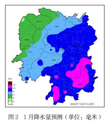 预计 1 月降水量湘西、湘北为 40~80毫米,其他地区为 80~120 毫米;和常年同期相比,湘南偏多 2~4 成,其他地区偏多 1~2 成。