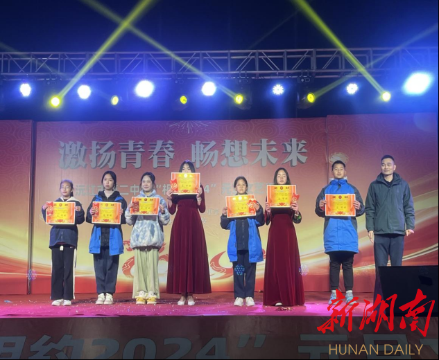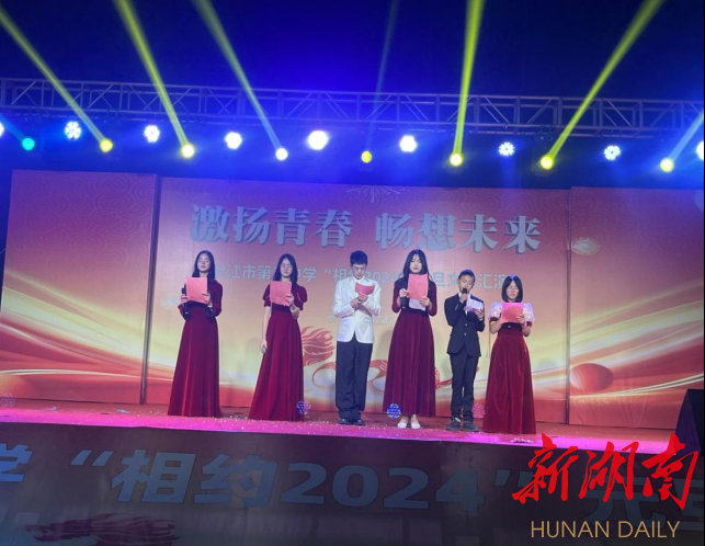 新湖南客户端1月2日讯(通讯员 苏迪光)12月28日,沅江二中举办了以“激扬青春,畅想未来”为主题的“相约2024”元旦文艺晚会。学校党支部书记、校长卜令波致开幕辞,总结了即将过去的2023年学校在育人、安全管理等方面的成果,也对即将奔赴的2024年向全校师生提出了要实现的目标,勉励教师团结奋发,争创佳绩,勉励学生勤奋向上,做新时期有为青年。