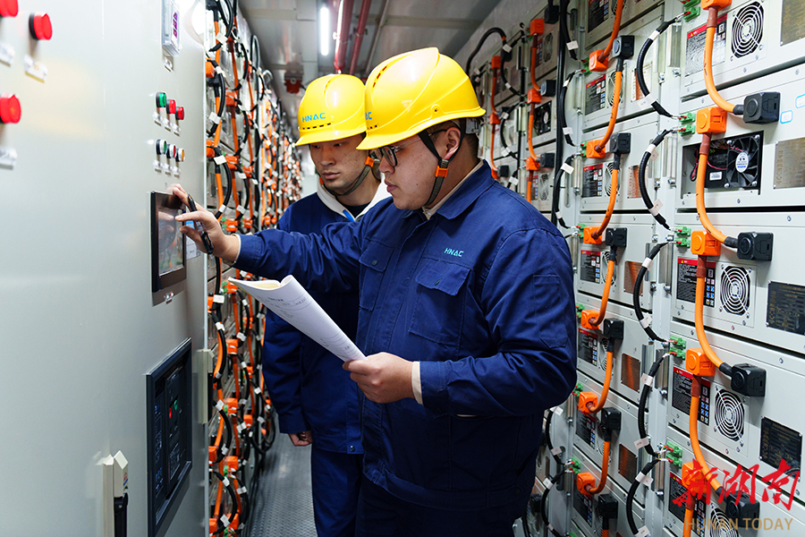1月31日,永州市冷水滩区谷源储能电站,运维人员在电池舱内进行日常巡检和维护。寒冬时节,社会用电量不断攀升,冷水滩区利用已并网运行的储能电站削峰填谷,有效解决供电压力,提高供电稳定性,助力迎峰度冬。 雷中祥 蒋静 摄影报道