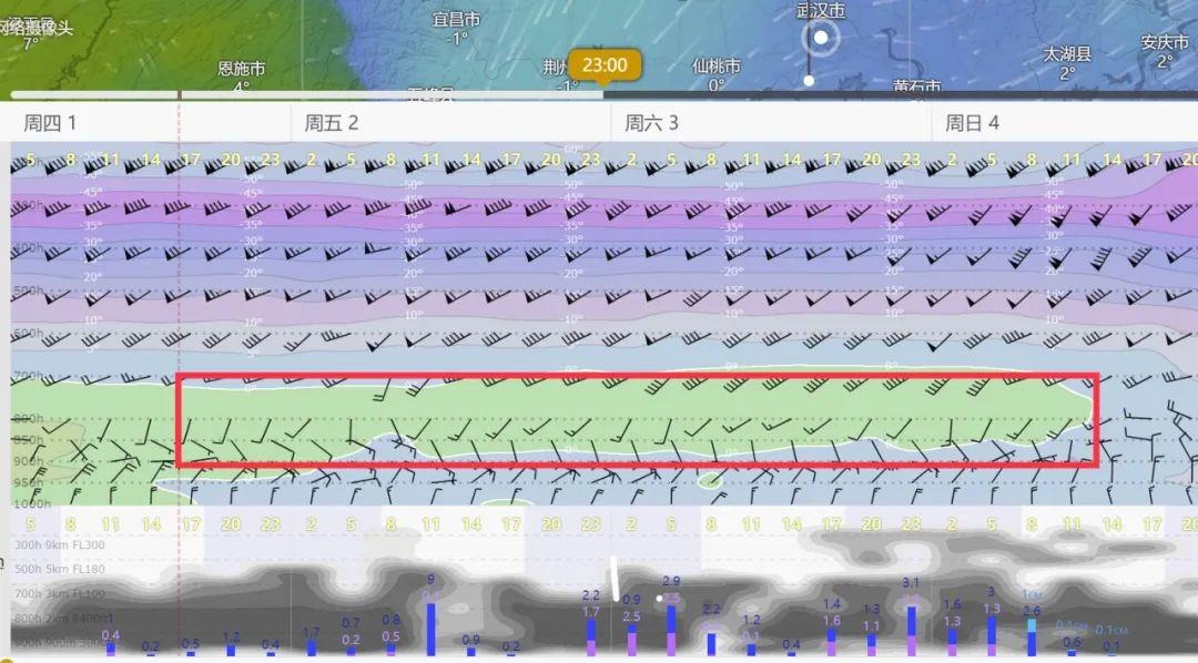 △武汉周边区域的气温随海拔高度(纵坐标)和时间(横坐标)变化的数值预报结果。可以看到2月2日—4日,这一区域约1000—3000米高空气温高于0℃(红框标出),但大气低层和地面又低于0℃,很有可能形成冻雨。