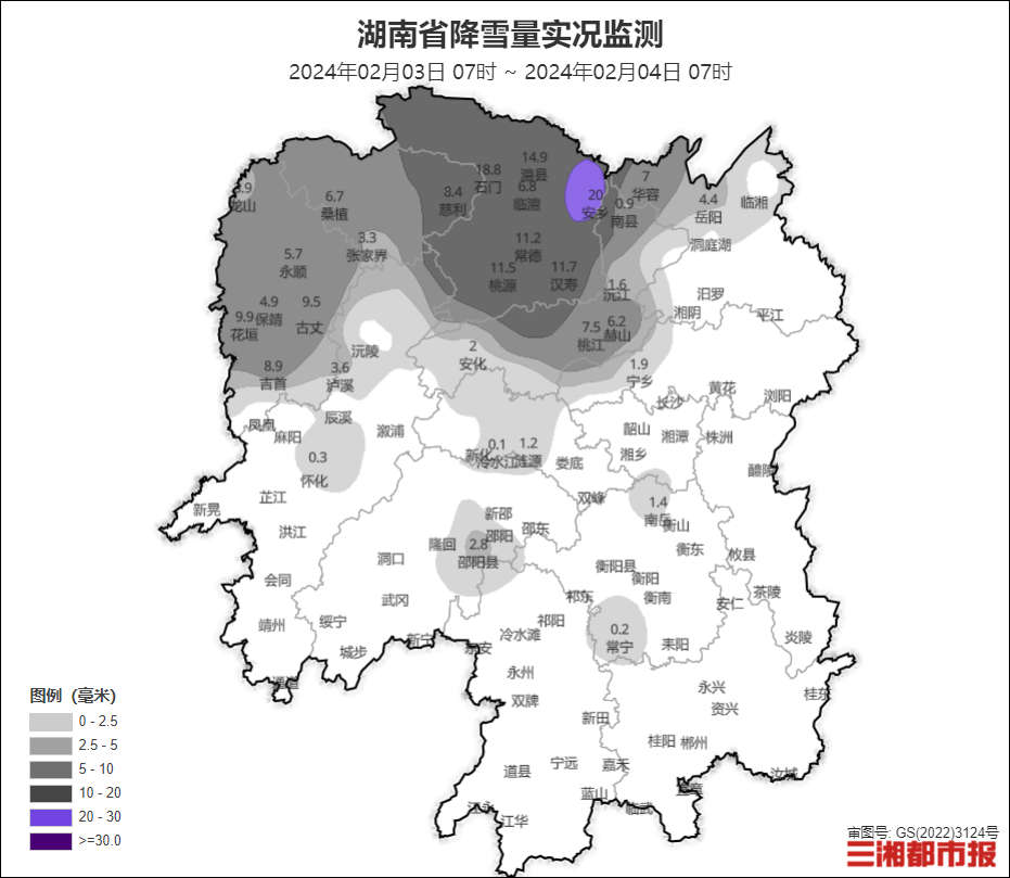 三湘都市报·新湖南客户端2月4日讯(全媒体见习记者 李致远 通讯员 梁潇)2月4日,记者从湖南省气象台了解到,3日7时至4日7时,湘北、湘中大部分地区出现雨雪冰冻天气。从降雪量看,湖南有33县(市、区)出现纯雪,其中16县(市、区)超过5毫米,6县(市、区)超过10毫米,安乡最大达20毫米。16县(市、区)最大积雪深度超过5厘米,常德(桃源、武陵区、石门、澧县、临澧)、益阳(南县)6县(市、区)超过10厘米,最大为石门站15厘米。