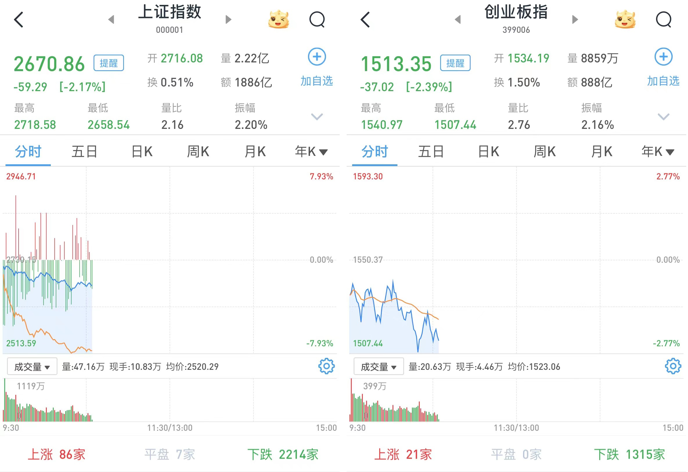 截至发稿时,沪指最大跌幅2.62%摸至2658.54点,深成指最大跌幅3.39%,创指最大跌幅2.77%。