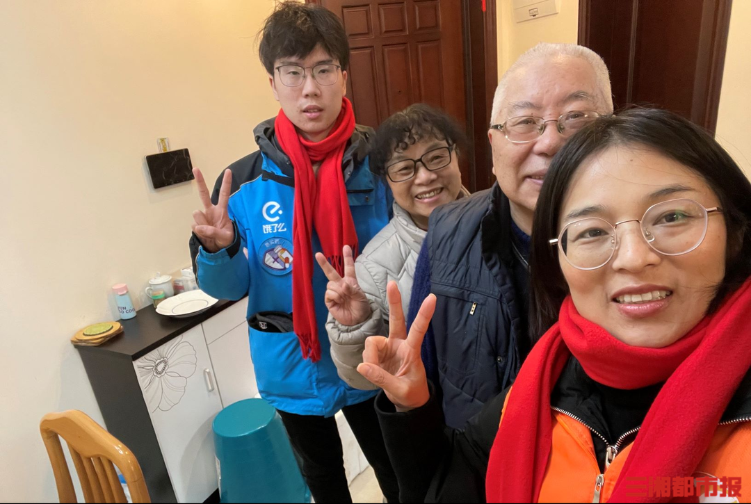 “真的很感谢他们,送餐路上又冷又辛苦,希望围巾能挡点风。”团年饭吃完,陈爷爷送给朱国志、小刘各一条红围巾。“00后”外卖小哥、中年社工、“70后”伉俪,三代人在镜头前齐刷刷比起剪刀手,露出幸福的微笑。