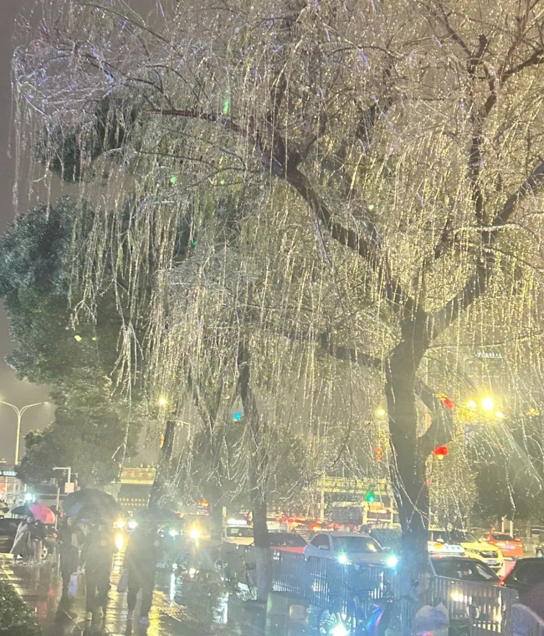 街面上不少树的枝条像镀了一层琉璃、很漂亮,外形像东北的雾凇。