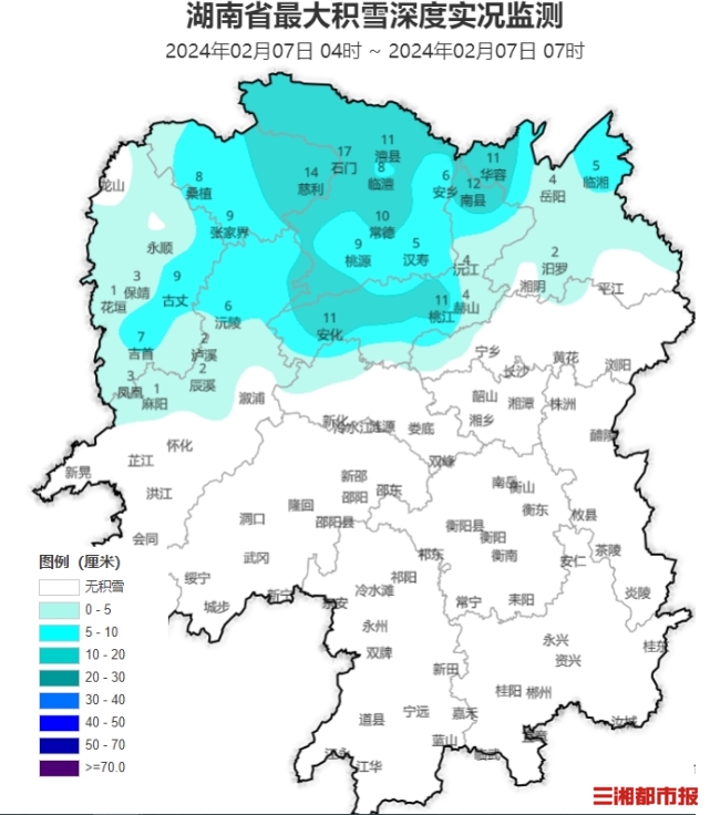 过去24小时(2月6日7时至7日7时),全省72县(市、区)出现雨雪冰冻天气,湘中、湘北30县(市、区)出现纯雪,最大为安化6.2毫米。湘西州、张家界、常德、益阳、岳阳、怀化6市(州)28县(市、区)出现积雪,张家界(慈利)、常德(石门、武陵区、澧县)、益阳(桃江、安化、南县)、岳阳(华容)4市(州)8县(市、区)最大积雪深度超过10厘米,最大为石门站17.0厘米。