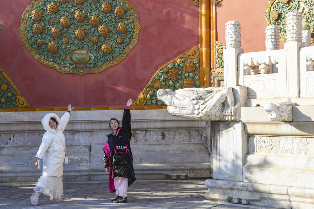 ↑游客在北海公园内参观九龙壁(1月24日摄)。