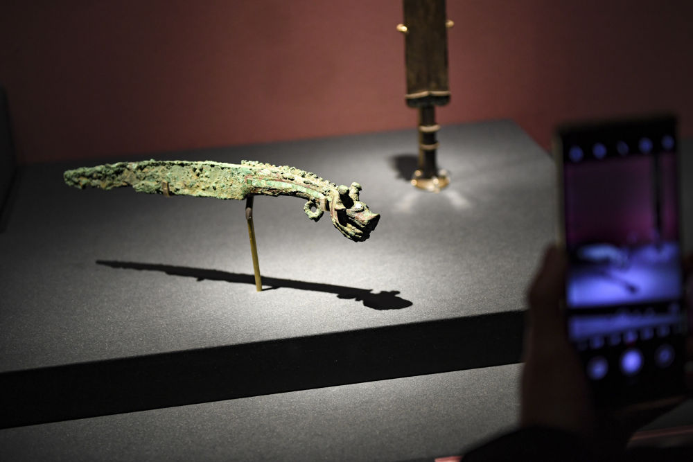 ↑这是在故宫博物院“历史之遇——中国与西亚古代文明交流展” 展出的龙首短刀(1月28日摄)。