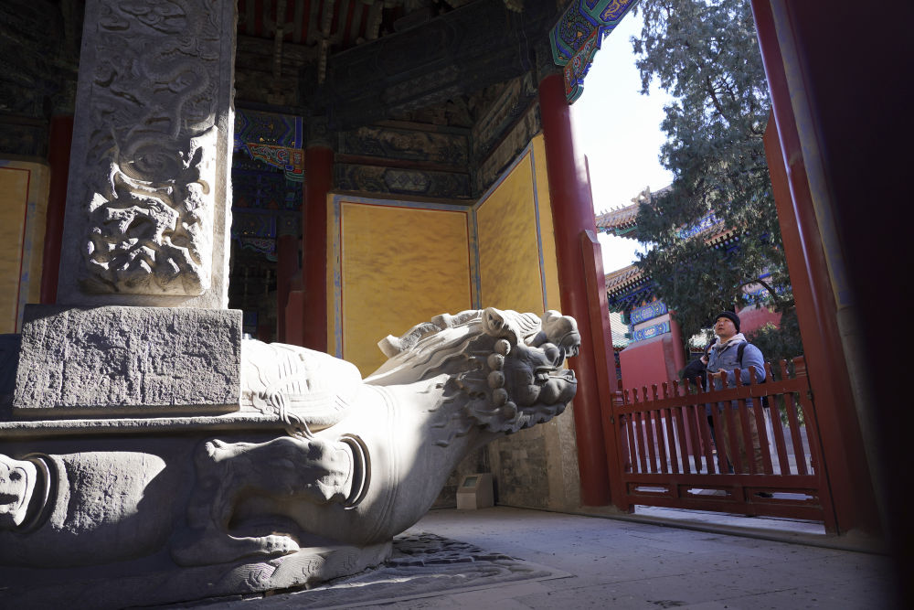 ↑一名小朋友在景山寿皇殿内云龙插屏前(1月23日)。