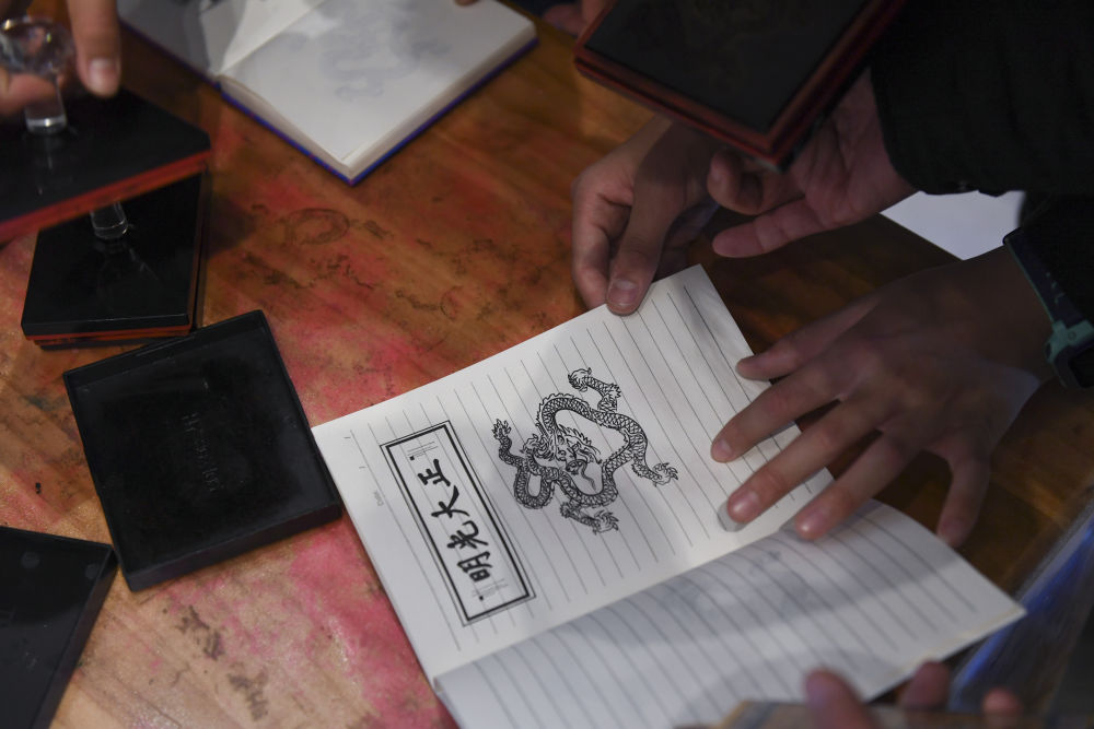 ↑游客在故宫汉字馆盖龙形象的印章(1月28日摄)。