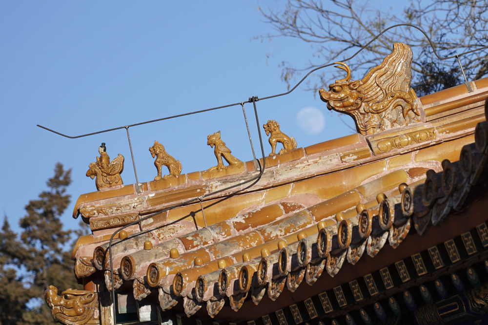 ↑这是景山寿皇殿院内一座古建屋顶局部,最右侧的脊兽是神话传说中龙生的九子之一“嘲风”(1月23日摄)。