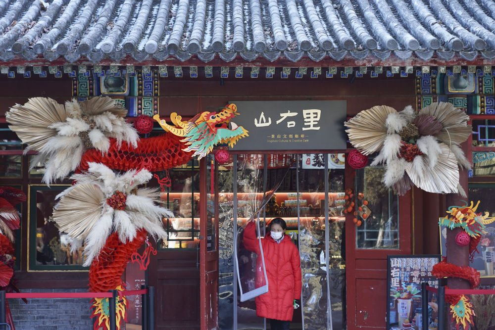 ↑这是在景山公园里一处文创咖啡店拍摄的龙形象节日装饰物(1月23日摄)。