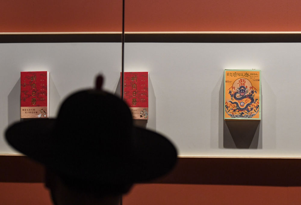 ↑在故宫文华殿,“汇流澄鉴:故宫出版社建社四十周年展”展出了一本封面是龙形象的《故宫日历》(1月28日摄)。