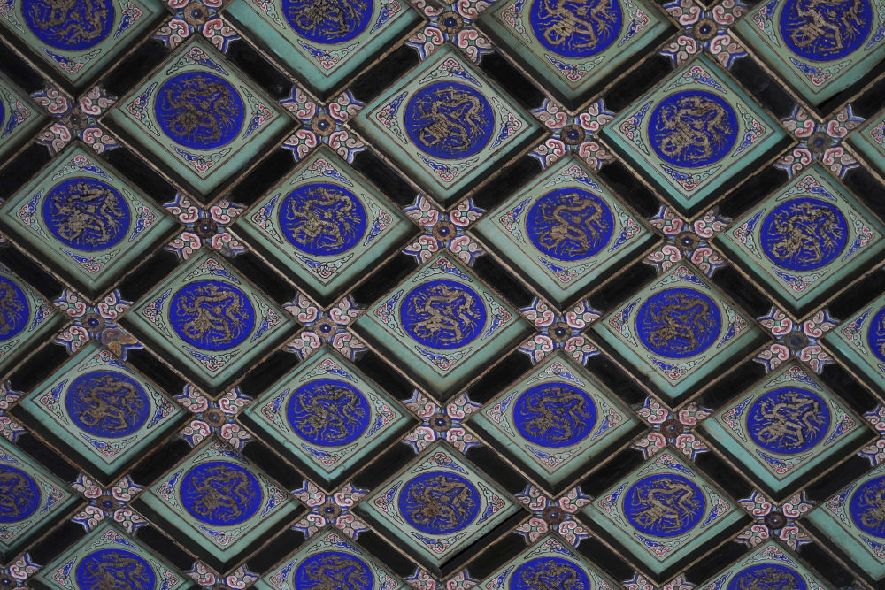 ↑这是北京国子监辟雍殿内拍摄的团龙合玺井口式天花(1月21日摄)。北京国子监位于北京中轴线缓冲区内。