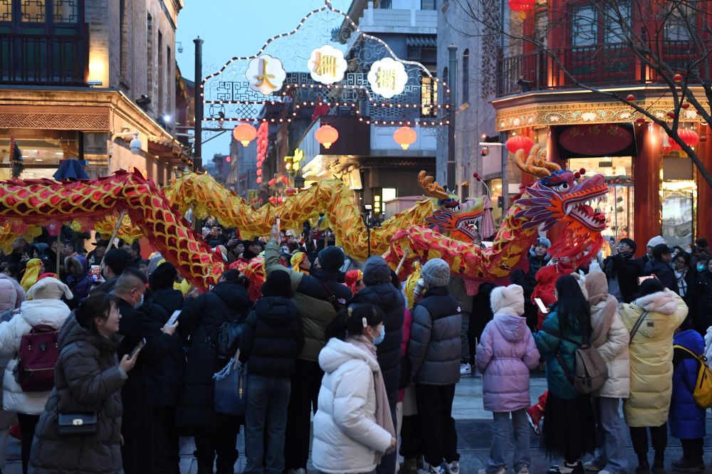 ↑游客在前门大街观看舞龙表演(2月2日摄)。
