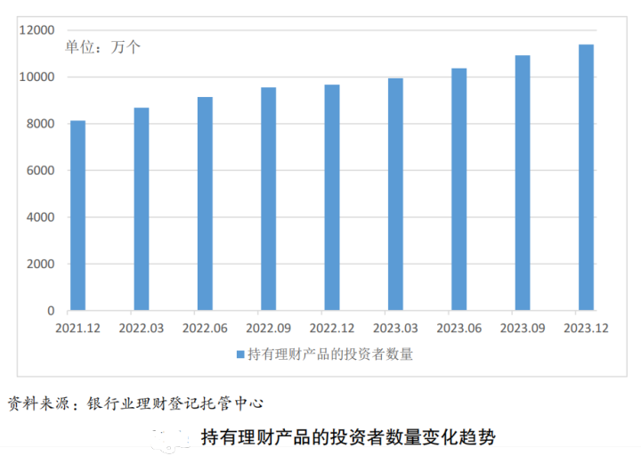 从结构上看,截至2023年末,理财市场仍以个人投资者为主。截至2023年末,持有理财产品的投资者数量突破1亿达到1.14亿个,同比增长17.84%。其中,个人投资者新增1686.29万个,达到1.13亿个,占比98.82%;机构投资者新增38.65万个达到134.60万个,占比继续提升至1.18%,2021年末、2022年末这一数据分别为0.77%、0.99%。