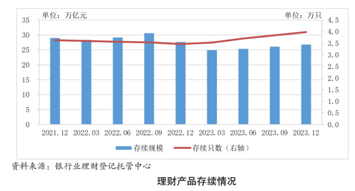 报告显示,截至2023年末,全国共有 228 家银行机构和31家理财公司累计新发理财产品3.11 万只,募集资金 57.08 万亿元。存续规模方面,截至 2023年末,全国共有258家银行机构和31家理财公司有存续的理财产品,共存续产品3.98万只,较年初增加14.86%;存续规模26.80万亿元。