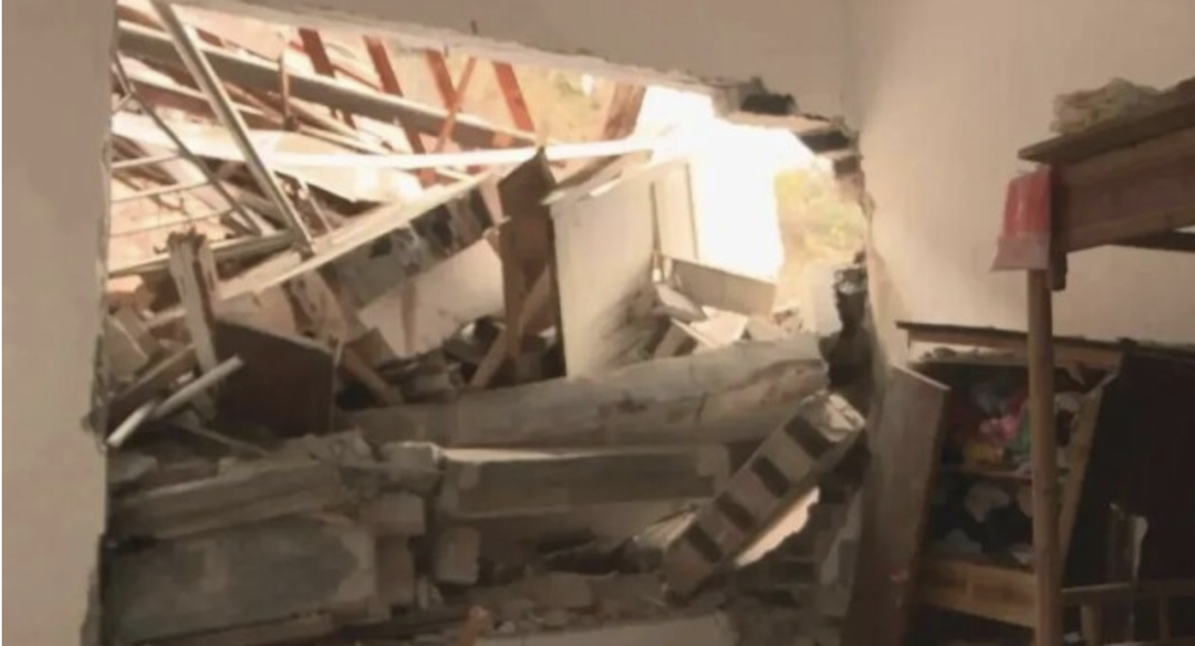 (麻阳县和平溪乡大坡村滑坡体前缘破坏房屋。通讯员提供)