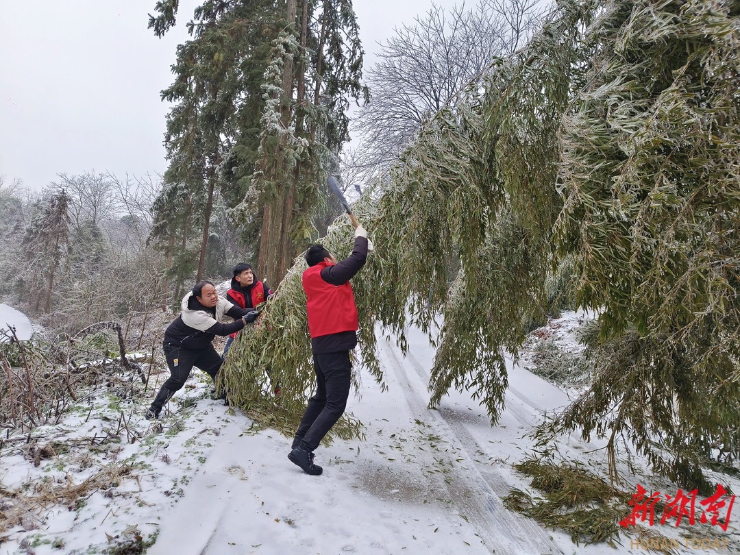 这是一场共赴风雨的行动。冻雨制灾性强,经过一夜风雨,资福镇域主干道及村道两旁树木折枝散落一地,部分树木连根倒地,引发道路堵塞,给群众出行及车辆通行带来不便,严重影响道路交通安全。资福镇迅速组织镇村干部、片组邻“三长”投入路面清障行动。同时,发布《关于号召全镇党员和片组邻“三长”积极投身防范应对低温雨雪冰冻天气的倡议书》,号召广大党员干部、片组邻“三长”闻雪而动,在冰雪清运、隐患排查、服务群众上当先锋、做表率。通过广泛宣传发动,镇村党员、片组邻“三长”闻令而动,群众自发参与,自备斧头、铲子等工具,参与路面清障工作,重点对主要出行道路的急弯陡坡路段及桥梁积雪进行清除。部分三长自行组织使用铲车对村内主要道路进行清障,勠力同心保卫镇域出行平安。七星村福兴塘组组长喻洪兵带领群众扫雪清路,搬运断木折枝;檀木桥村竹高组邻长肖新民、罗友民,带领组上村民清理路障,拉通40余户村民的通行道路……