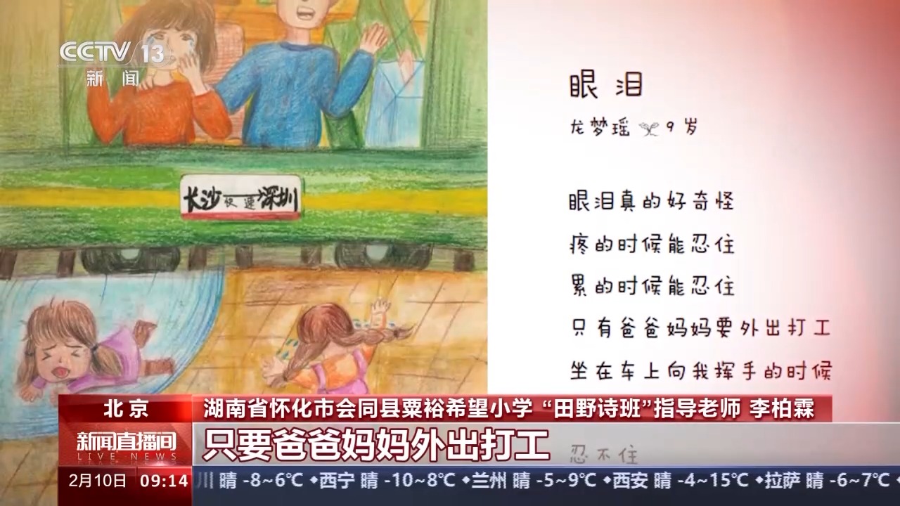 湖南省怀化市会同县粟裕希望小学“田野诗班”指导老师 李柏霖:这就是龙梦瑶写的,眼泪真的好奇怪,疼的时候能忍住,累的时候能忍住,只要爸爸妈妈外出打工,坐在车上向我挥手的时候,眼泪忍不住。