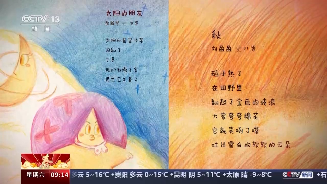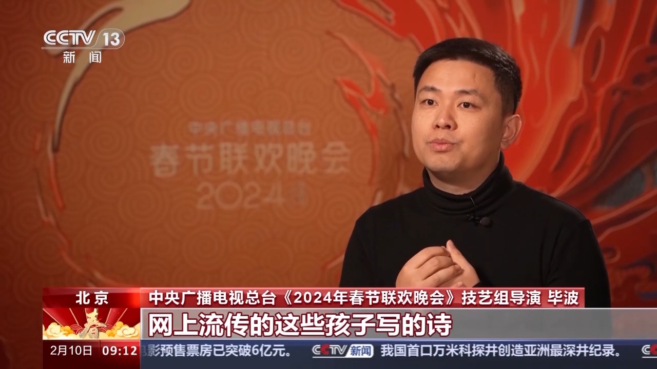 中央广播电视总台《2024年春节联欢晚会》技艺组导演 毕波:今年强调人民的春晚,我们看到了很多网上流传的这些孩子写的诗,有好多诗就特别打动我,没有那么多辞藻的堆砌,你不由得会去心动,在春晚这个舞台上面去展现孩子们天马行空的想象力。