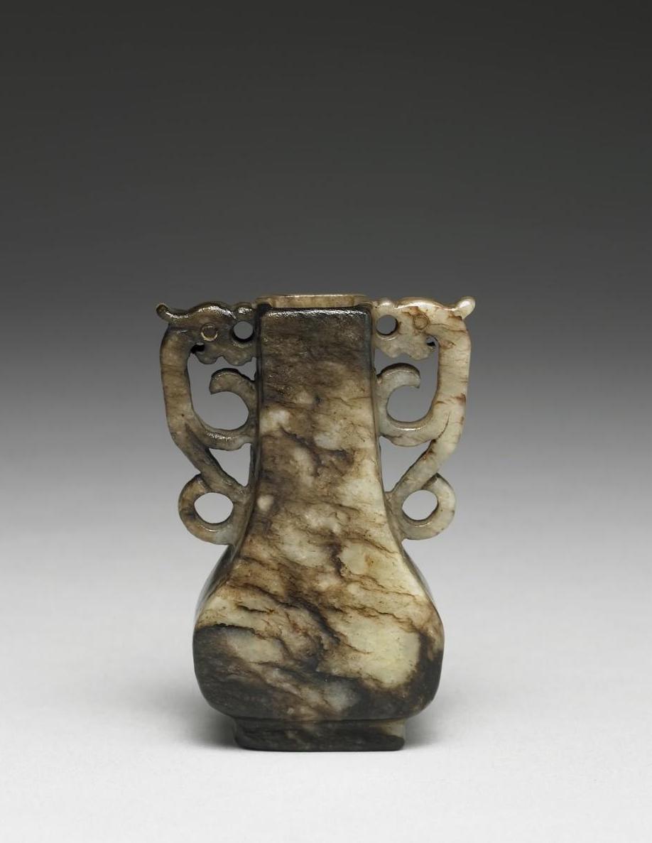 玉质,一面满布黑褐色块斑,全器带丝状褐绺,为石墨入侵玉矿后之呈色。小瓶,方口,长颈,溜肩以下置方鼓腹,矮圈足,颈两边镂雕侧身螭龙形耳。器身光素无纹,打磨抛光略粗,但口沿及双耳等处似经盘摩,皮壳温润,古朴的质感为明代玉器特征之一。尺寸小巧,现收储于多宝格中。