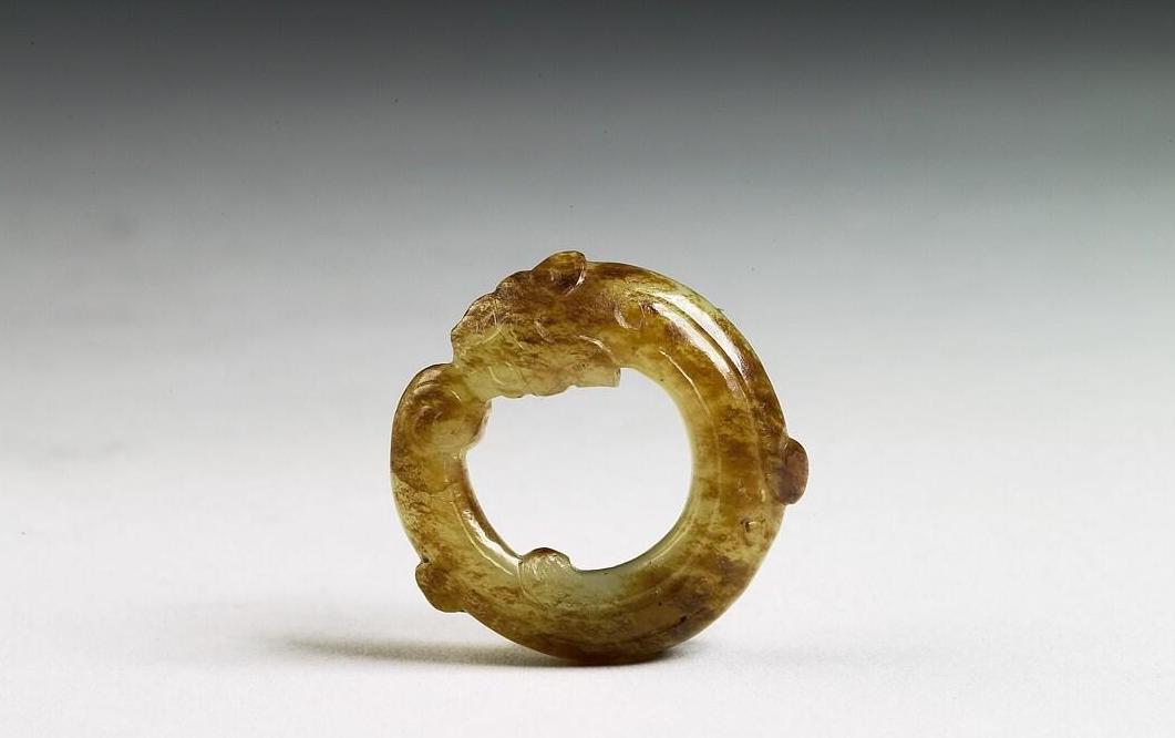 玉质,全器以龙为造型,首尾相连,连成圆环形。此器为东汉时期和带钩成组的腰带扣件。