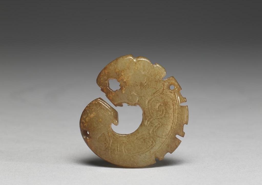 器成圆环带缺的形式,类似耳饰玦,龙首的部份较宽,但经过削磨故略薄,眼睛也因此仅仅残留些微线条,张口露齿,有角,背脊饰有起伏不规则的鉏牙,尾部略窄。身躯表面装饰双钩阴刻的弯转线条。鉏牙及近尾端处各有一穿。