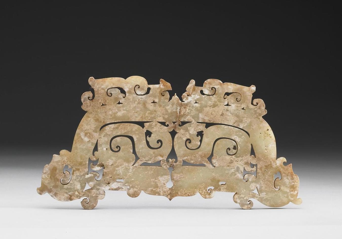 玉质,全器受沁呈淡褐色,局部白化。本件玉器未完工,只完成了大部分的镂空,上下器缘的镂空仍在初始制作阶段;器表可观察到众多短直线,此为镂空之前先琢磨成的定位线。