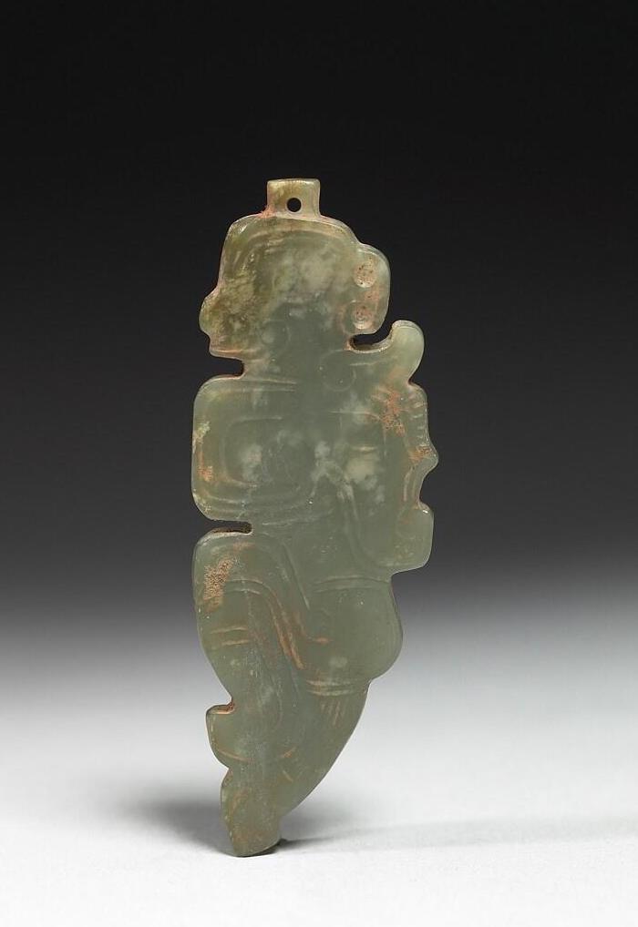 玉质,呈青灰色。雕一蹲踞状的侧面人像,人的胸膛和一龙母题相结合。人头顶上有一方形凸起,钻有一孔,用以穿系。