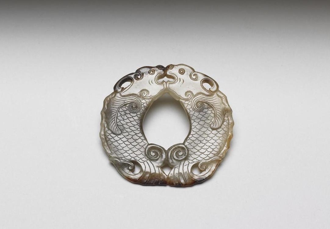 玉质,灰绿色有大片赭黄色斑,部分边缘沁黑。器圆片扁平,作二只鱼龙相对状,鱼龙直睛张嘴圆鼻有角,口与尾处皆有孔以供佩挂,背、腹与尾鳍硕大,琢涡形线条,身躯饰鱼鳞纹。双面同纹。