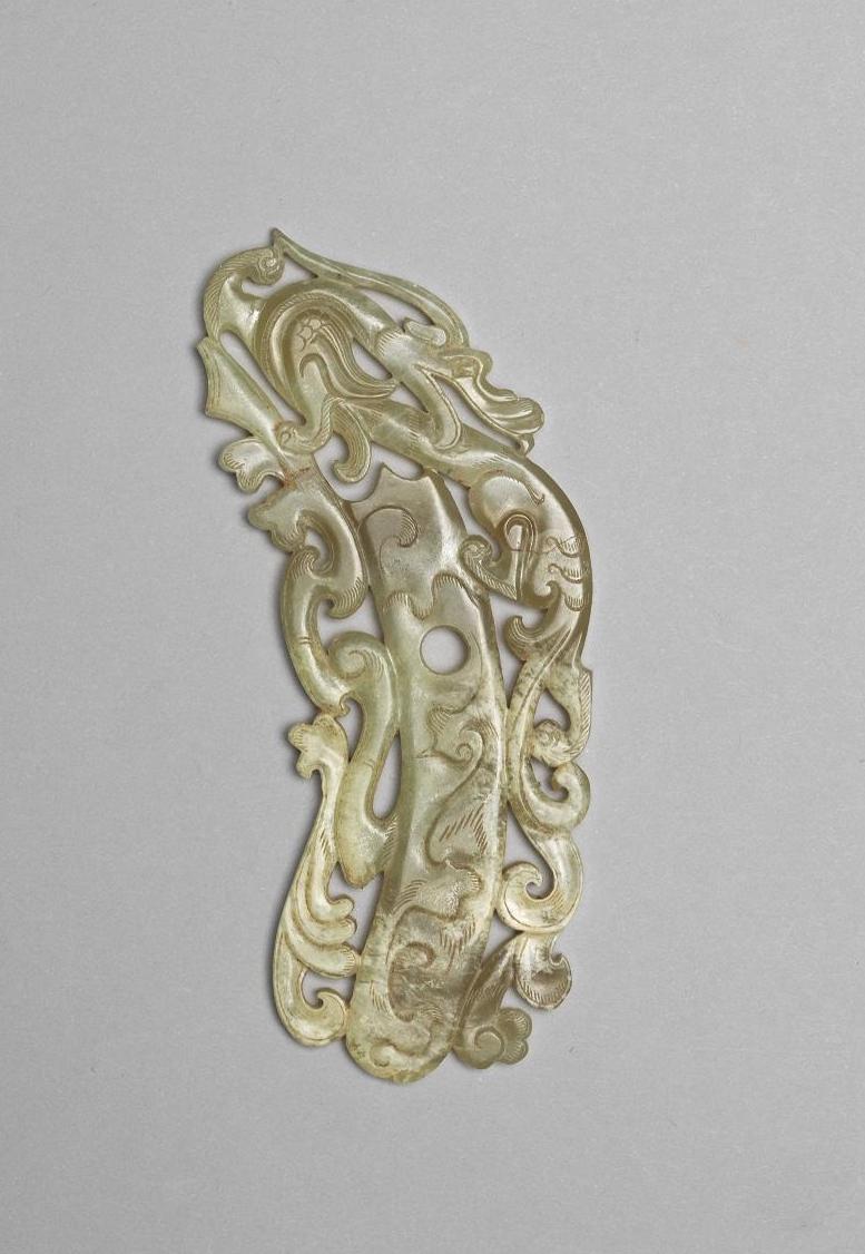 玉质,局部受沁白化。位居韘形佩中央的玉韘主体细长弯曲,中孔较小,设计重心集中在上方呈回顾貌的神龙。神龙鼻吻较长,轮廓曲线较为缓和,尾部向下延长并且云气化,和全器的云气融合而一,此为东汉常见的设计形式。