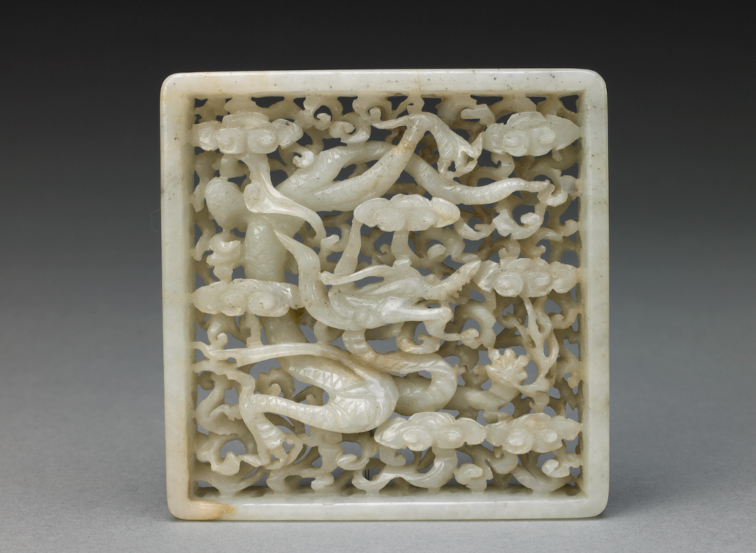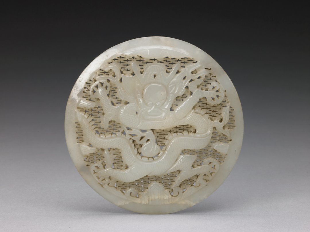 玉质,器缘有褐黄斑块。圆盘正面饰行龙纹,尖吻,长角,角根处琢一排圆珠,丰鬣,细颈,身躯似飘带般弯曲翻转,平面起伏有致,全身满覆细鳞,鳞上并阴刻细线纹,四肢肌理饱满,足有三趾,趾甲尖钩如镰刀般锋锐。间隙填以镂空卷草纹锦地,层次略低于龙纹。背面的纹饰一如正面,除了龙的须鬣较粗、鳞片上无细纹外,其他细节均无简省。就纹样而言,如此雄强矫健的龙纹,与〈北宋真宗禅地玉册〉所附玉匮上之嵌片的龙纹相比,两者近似,而风格更像辽代陈国公主墓出土的一件金花银奁上者,只是此玉盘龙纹的细,与本院藏宋代花间行龙纹的缂丝作品差可比拟,故推断此盘应属11世纪上半,辽或北宋的作品。