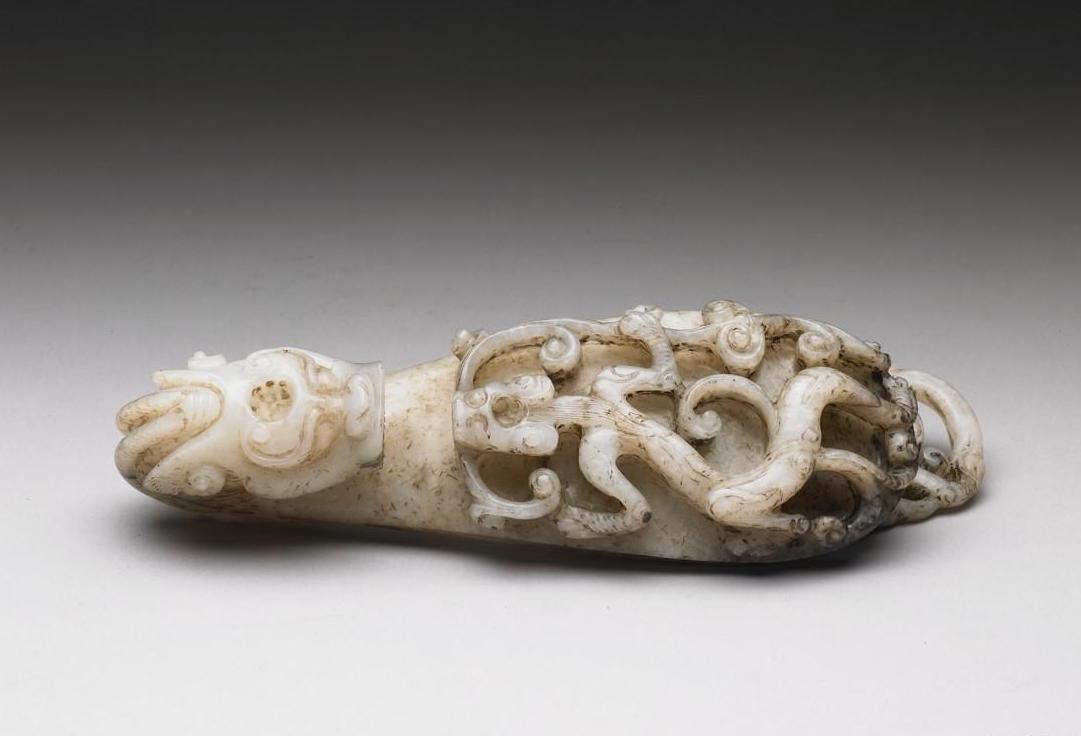 玉质,莹白杂黑赭斑。器作带钩形,钩首饰龙头,器面饰高浮雕螭纹,背有一方形柱,柱上附活环,环面琢螭纹。